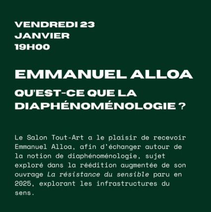 Emmanuel Alloa, professeur à l'Université de Fribourg et chercheur en résidence d'écriture pour le mois de janvier 2026, donnera une conférence, le vendredi 23 janvier, au Salon Tout-Art, sur la diaphénoménologie, perspective centrale de son ouvrage La résistance du sensible. Merleau-Ponty critique de la transparence, dont la réédition augmentée est parue en 2025.