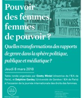Table ronde organisée par Delphine Gardey (Professeur d'histoire contemporaine, Université de Genève / résidente 2017-2018 de l'IEA de Paris) et Gretty Mirdal (directrice de l'IEA de Paris) à l'occasion de la journée internationale des droits des femmes, avec la participation de Najat Vallaud-Belkacem (ex Ministre des Droits des femmes (2012 - 2014), ex Ministre des Droits des femmes, de la Ville, de la Jeunesse et des Sports (2014), ex Ministre de l'Éducation nationale, de l'Enseignement supérieur et de la Recherche (2014 - 2017)), Catherine Achin (Professeur de sciences politiques, Université Paris Dauphine), Cécile Daumas (rédactrice en chef adjointe, service Idées, Libération) et Laure Bretton (journaliste politique, Libération).