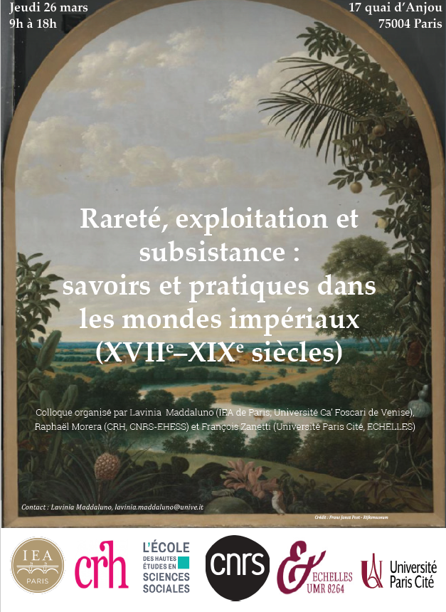 Co-organised by Lavinia Maddaluno, Raphaël Morera and François Zanetti, with the support of the CRH (EHESS) and ECHELLES (Université Paris Cité), the workshop will conclude with a round table discussion moderated by Steven Kaplan. By questioning scarcity not as a simple ‘lack,’ but as a historical construct central to imperial logic, aimed at legitimising the exploitation and extraction of natural resources in overseas colonies, this meeting aims to renew the analysis of the relationships between exploitation, subsistence and power.