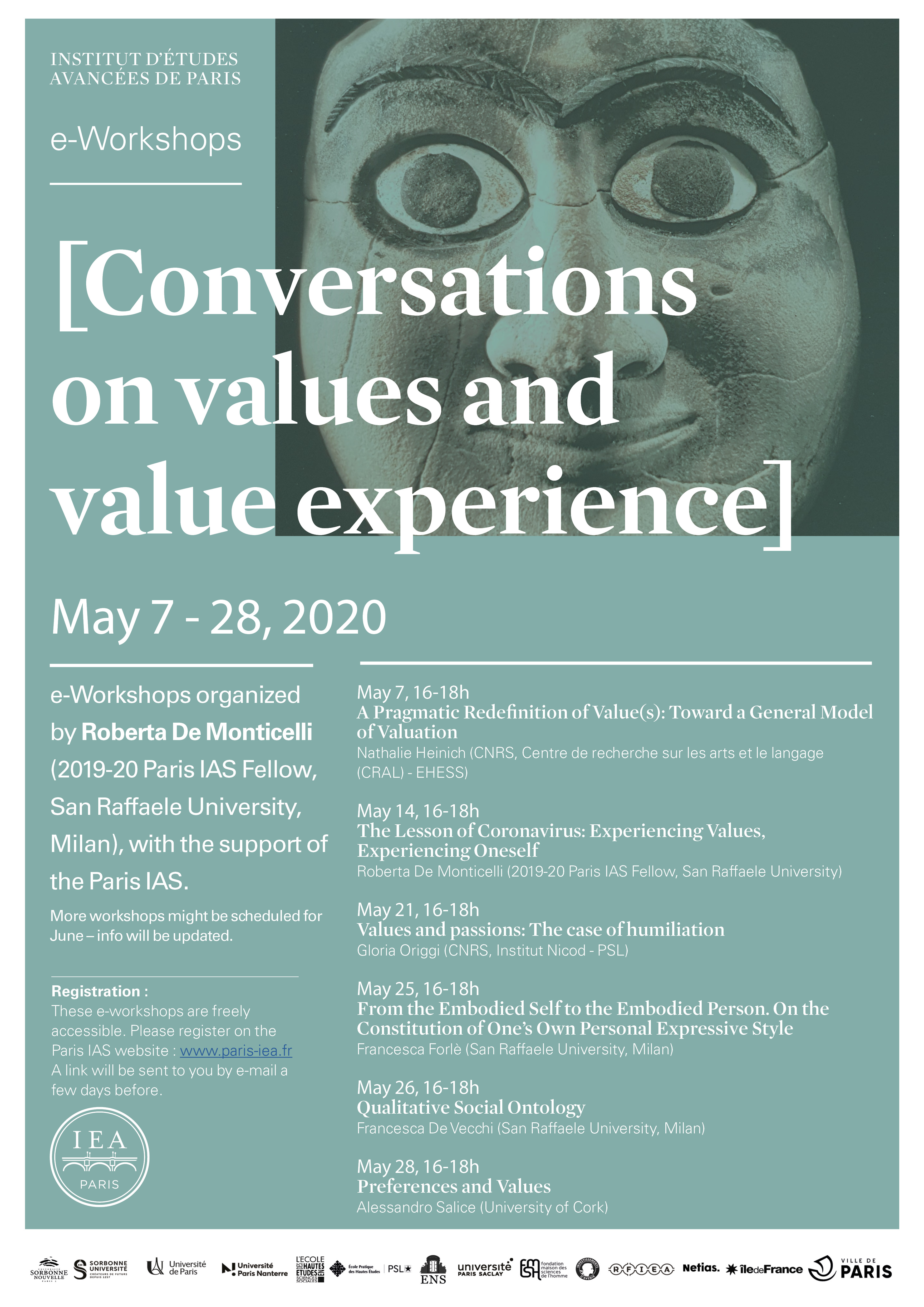 E-workshop de Francesca De Vecchi (Università Vita-Salute San Raffaele) dans le cadre du cycle « Conversations on values and value experience » organisé par Roberta de Monticelli, résidente chercheuse 2019-2020 de l'IEA de Paris. E-workshop de Gloria Origgi (CNRS, Institut Nicod - PSL) dans le cadre du cycle « Conversations on values and value experience » organisé par Roberta de Monticelli, résidente chercheuse 2019-2020 de l'IEA de Paris. E-workshop organized by Roberta de Monticelli, 2019-2020 Paris IAS Fellow, as part of the cycle « Conversations on values and value experience » E-workshops cycle organized by Roberta de Monticelli, 2019-2020 Paris IAS Fellow, with the support of the Paris IAS R. De Monticcelli is Professor of Philosophy and 2019-2020 Paris IAS Fellow Seminar by Roberta de Monticelli, 2019-2020 Paris IAS Fellow, as part of the CREA XVIII / Programme d'Etudes sur l'Angleterre de la Renaissance aux Lumières : "Matière, matérialité, matérialisme". Conference by Roberta De Monticelli, resident researcher 2019-2020 at the Paris Table ronde en présence de Roberta de Monticelli, résidente chercheuse 2019-2020 à l'IEA de Paris Masterclass by Roberta de Monticelli (2019-2020 Paris IAS fellow) as part of the Festivalfilosofia Festival |