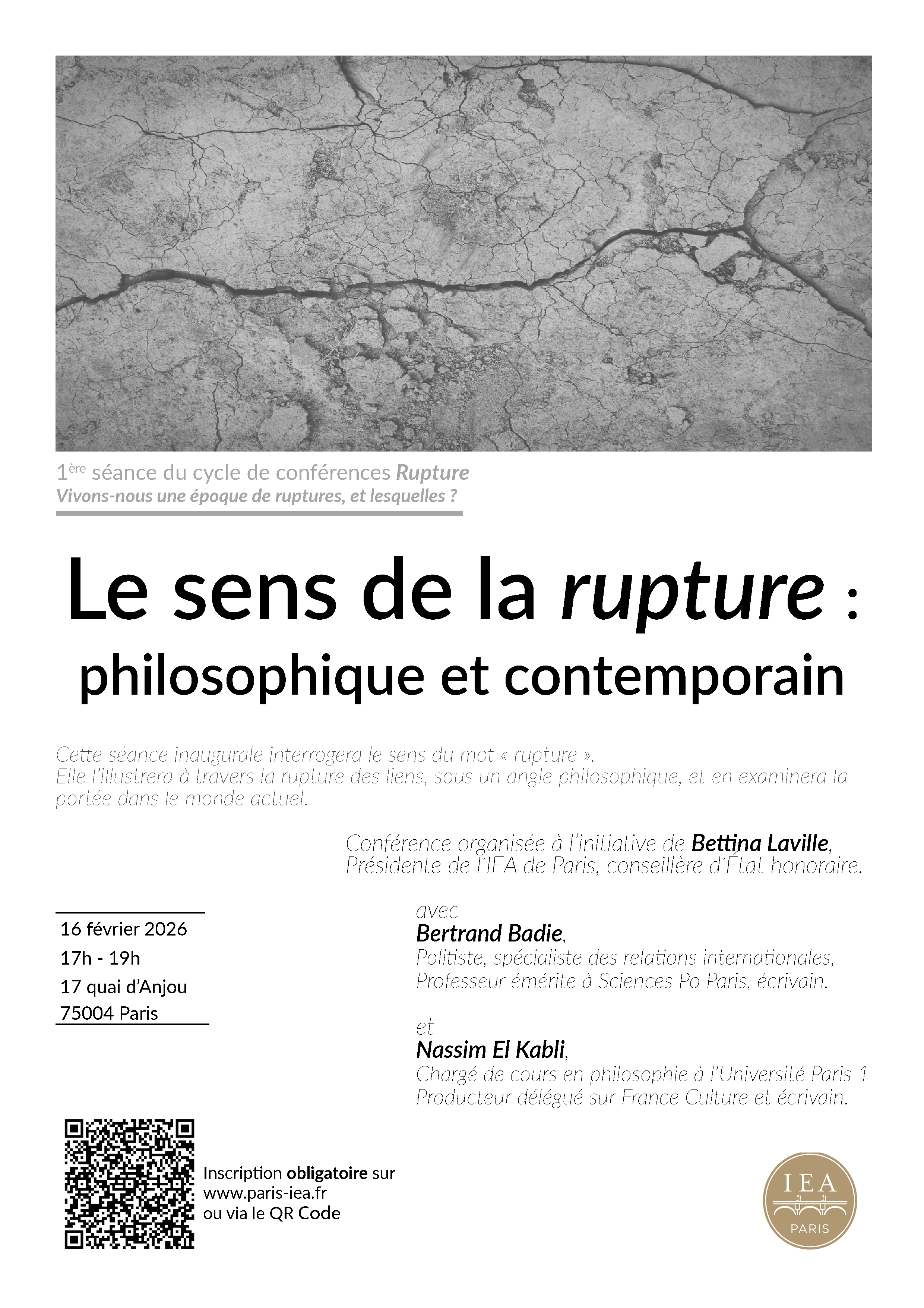 Organisé par Bettina Laville, présidente de l’IEA de Paris et Conseillère d’État honoraire, ce cycle de rencontres de quatre séances consacrées à l’analyse des transformations contemporaines. Il explore les notions de rupture et de transition, perçues à la fois comme des espoirs, des menaces ou des vertiges, et leur impact sur les valeurs, la société et la vie quotidienne. Les discussions s’appuieront sur des perspectives intellectuelles, politiques et anthropologiques pour comprendre les dynamiques profondes qui façonnent notre époque.