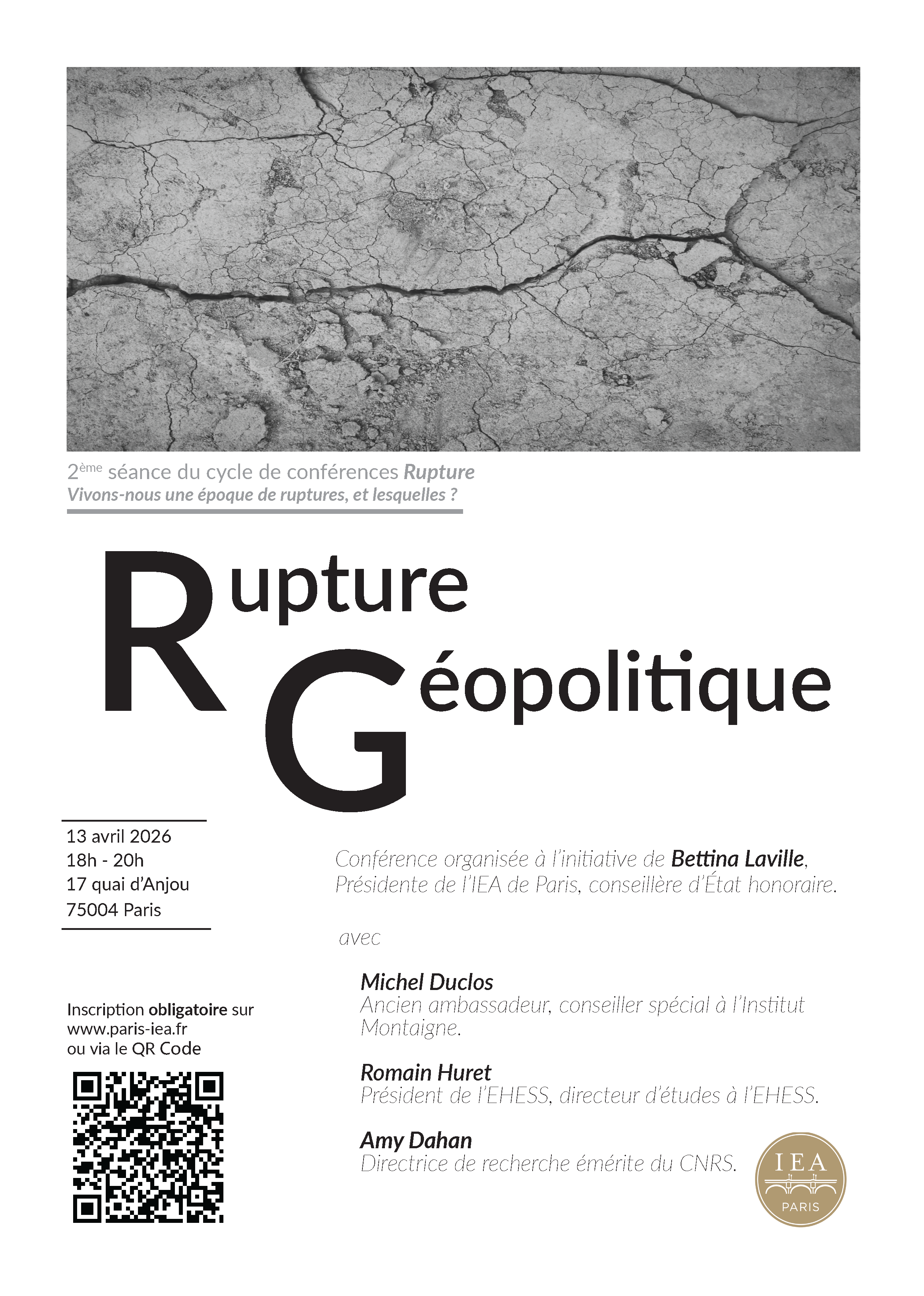 Organisé par Bettina Laville, présidente de l’IEA de Paris et Conseillère d’État honoraire, ce cycle de rencontres de quatre séances consacrées à l’analyse des transformations contemporaines. Il explore les notions de rupture et de transition, perçues à la fois comme des espoirs, des menaces ou des vertiges, et leur impact sur les valeurs, la société et la vie quotidienne. Les discussions s’appuieront sur des perspectives intellectuelles, politiques et anthropologiques pour comprendre les dynamiques profondes qui façonnent notre époque.