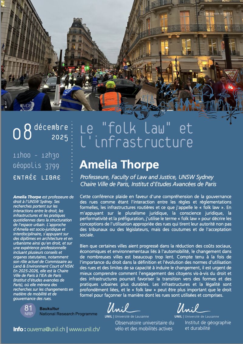 Conférence d'Amelia Thorpe (UNSW Sydney, IEA de Paris) organisée par l'Observatoire universitaire du vélo et des mobilités actives de l'Université de Lausanne. Entrée libre, ouvert au public.