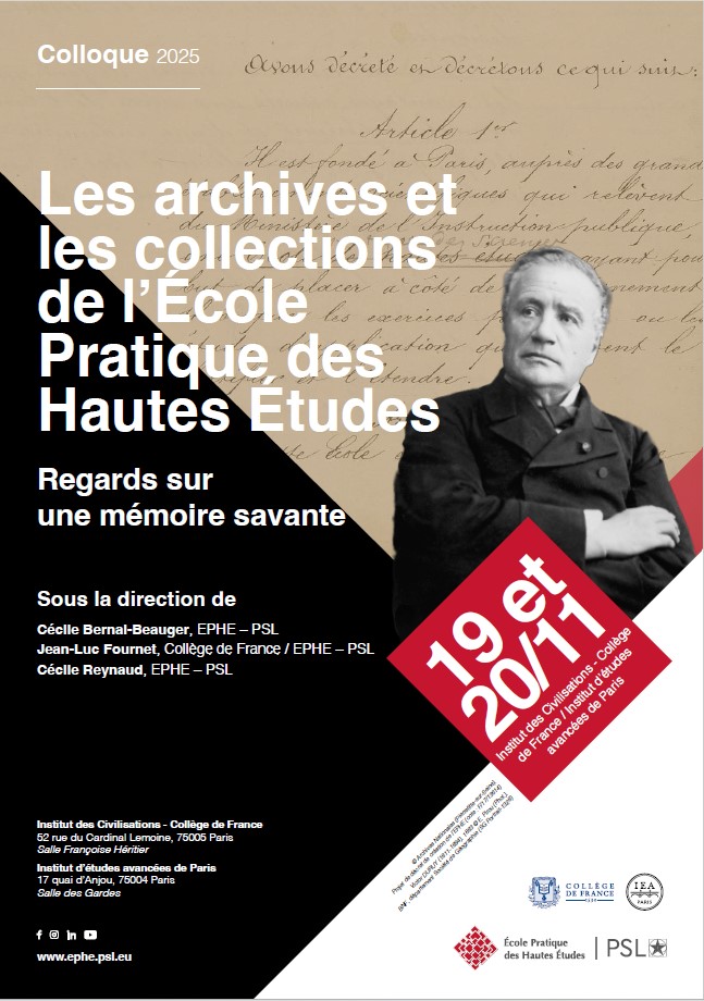 Le colloque « Les archives et les collections de l'École pratique des hautes études : regards sur une memoire savante » s'inscrit dans le contexte de recherches actuelles sur l'histoire de l'institution. A la suite de l'ouvrage de célébration des 150 ans de l'École pratique des hautes études (L'École pratique des Hautes Etudes. Invention, érudition, innovation de 1868 à nos jours, direction. Patrick Henriet, Somogy, 2018), le service de la recherche et des archives de l'EPHE-PSL a publié sous la direction de Cécile Bernal-Beauger, responsable, au sein du service de la Recherche, des archives de l'École pratique des hautes études (EPHE-PSL) un inventaire détaillé des archives de l'institution qui répertorie et signale tous les fonds d'archives de l'EPHE - connus jusqu'ici - qui ont été traités, puis versés ou déposés par l'institution auprès de services d'archives ou bibliothèques.
