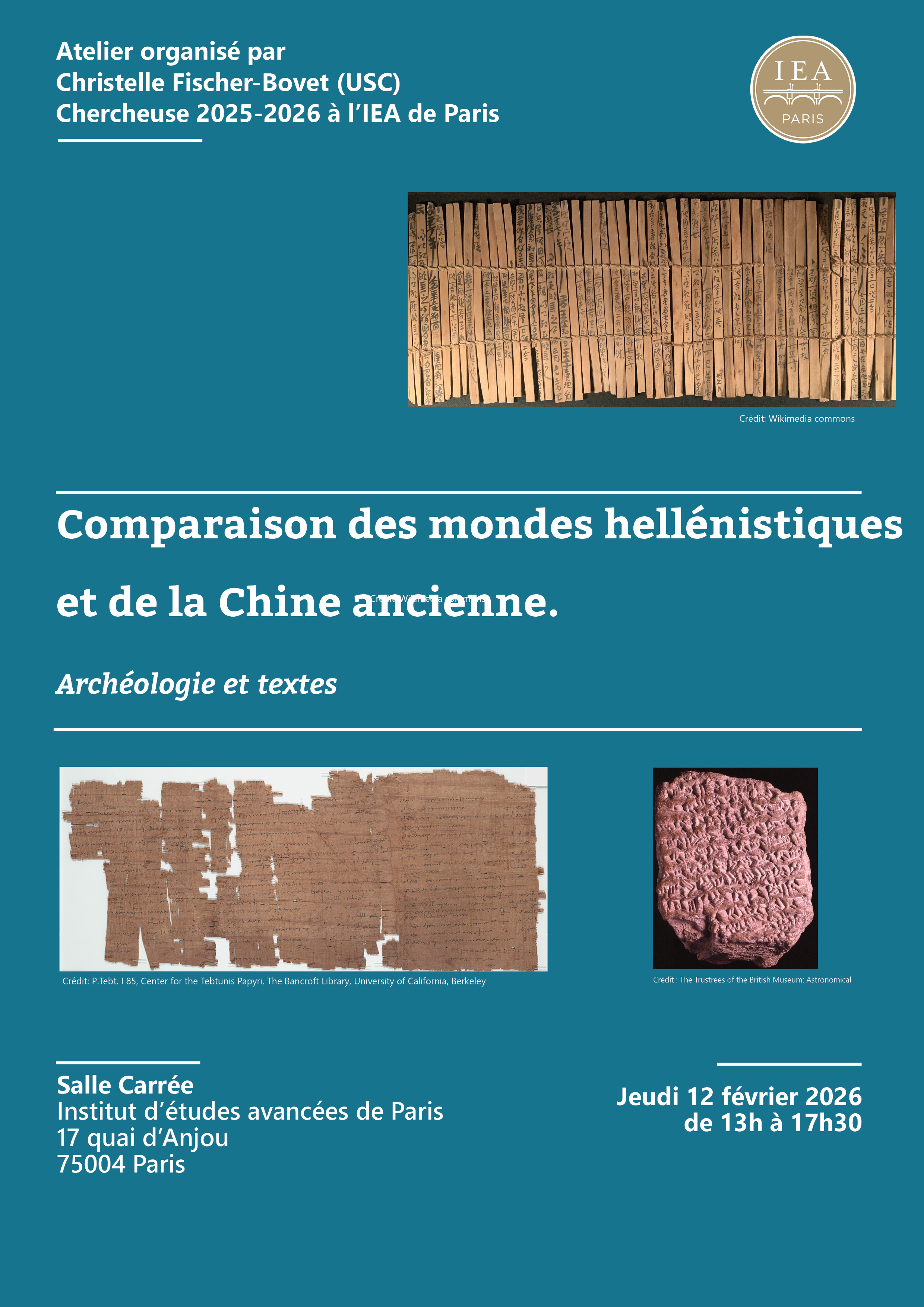Christelle Fischer-Bovet, professeure associée de lettres classiques, d'histoire et d'études du Moyen-Orient à l'Université de Californie du Sud (USC) à Los Angeles et chercheuse en résidence de l'année 2025-2026 à l'IEA de Paris, organise un atelier intitulé "Comparaison des mondes hellénistiques et de la Chine ancienne. Archéologie et textes, le 12 février de 13h à 17h30 au sein de l'Institut (Salle Carrée, Niveau -1).