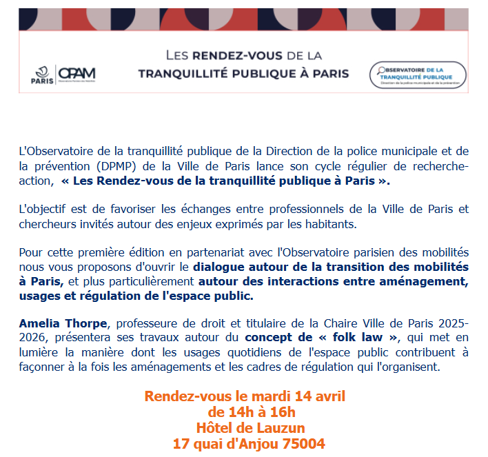 Amelia Thorpe, professeure de droit et titulaire de la Chaire Ville de Paris 2025-2026, présentera ses travaux autour du concept de « folk law », qui met en lumière la manière dont les usages quotidiens de l'espace public contribuent à façonner à la fois les aménagements et les cadres de régulation qui l'organisent.